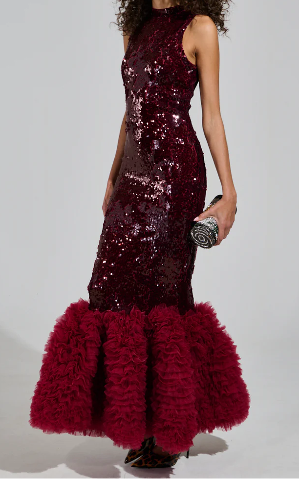 You are opulence personified in The Belle Of The Ball Sequin Ruffle Maxi Dress. This gorgeous, curve-hugging gown is crafted from a smooth, semi-stretchy base fabrication in a rich wine-red shade adorned with two-way tonal sequins. It boasts a sleeveless design, a mock neckline, and a mermaid-inspired silhouette with a fabulously flamboyant, intricately layered ruffled hem made from high-quality tulle. Complete with a slick satin-lined interior and a tonal back zipper closure. Style it with burgundy heels and accessories for a marvelous monochromatic moment.