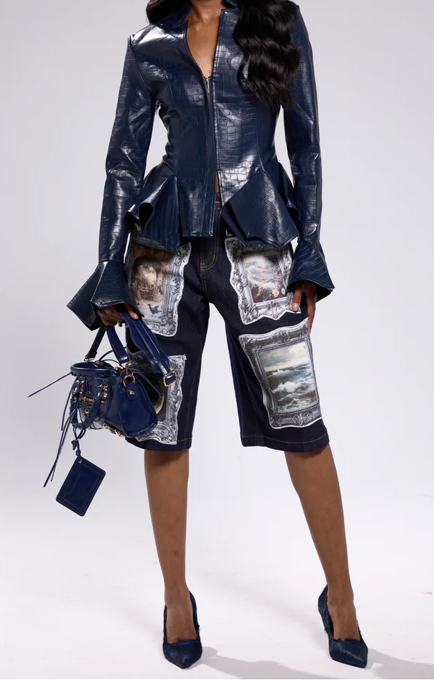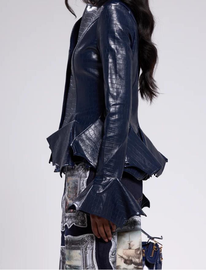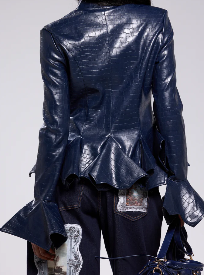 The Carmen Bodycon Blazer is a sculptural jacket tailored to perfection, crafted from high-shine croc-embossed faux leather. It features a sleek mock collar with a plunging neckline, structured shoulders, long sleeves with flared cuffs, a curve-hugging bodice that leads into a chic peplum silhouette, and a slightly pointed hemline. Complete with a concealed front zipper closure. Try pairing with anything from satin trousers to pencil skirts for a finished look.