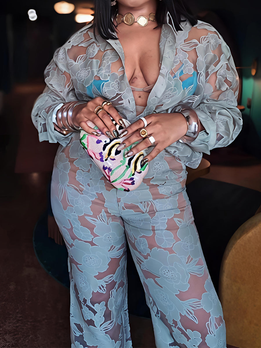 This elegant two-piece set features delicate openwork lace and embroidery, showcasing feminine grace. The top and trousers are perfectly paired, with the sheer lace adding a touch of mystery, while the exquisite embroidery details demonstrate impeccable taste.