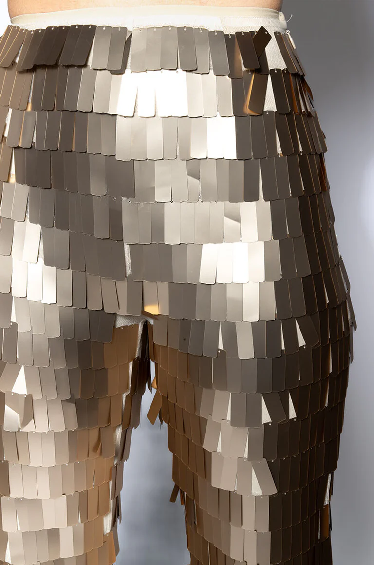 The Valentina Sequin Fringe Trouser is made from a sheer mesh fabrication and features a high rise waist, large, rectangular sequin fringe detailing, a flared leg silhouette, slick, opaque lining, and a tonal side zipper closure.